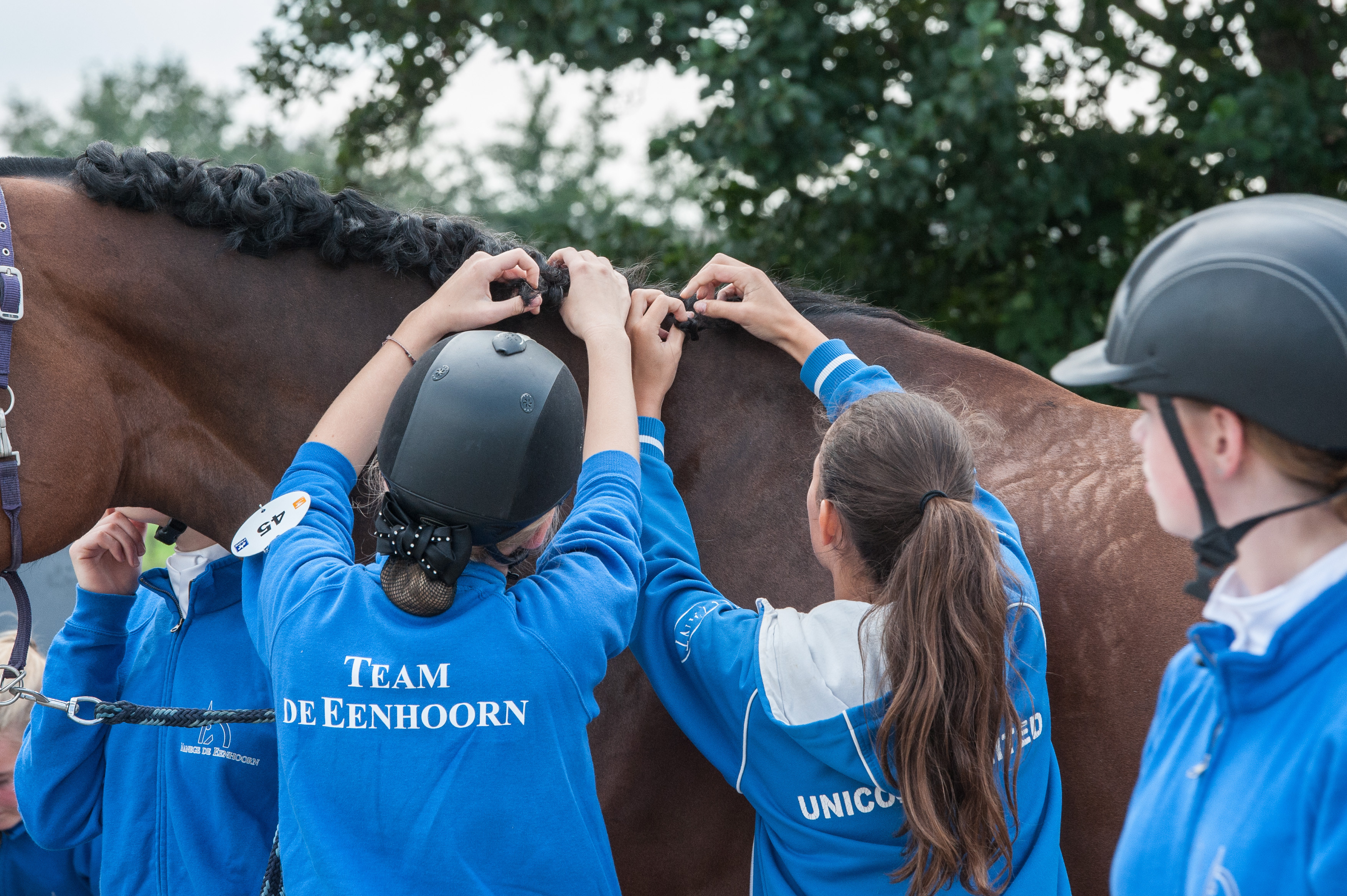 Naast de organisatie doen ze ook vaak mee met een groep ruiters. “We gaan altijd met een hele ploeg en maken er een gezellige dag van. Vooraf bereid ik de ruiters ook altijd voor met een stukje theorie dat je bijvoorbeeld best een volte mag draaien als het paard voor je minder voorwaarts loopt. Verder kijken we op de dag zelf naar hoe het paard loopt en geven we nog wat laatste tips. Daarmee hebben we al meerdere successen behaald waaronder kampioenen, finalisten en de best zittende manege.”