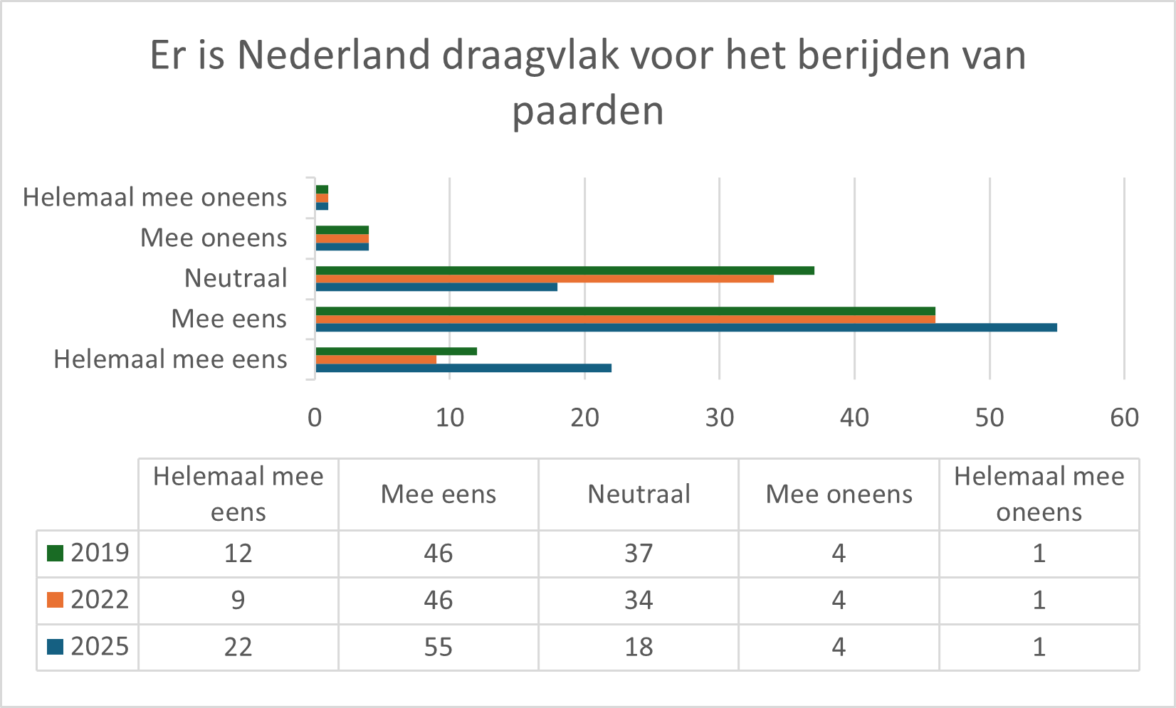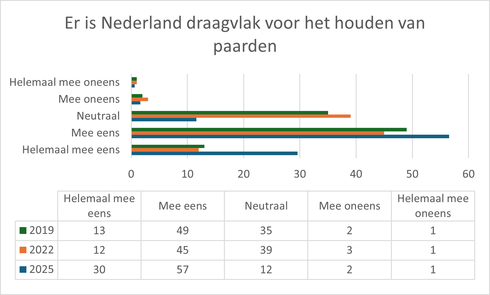Ondanks verschillen in steekproef en vraagstelling zijn duidelijke en opvallend positieve trends zichtbaar. In de onderzoeken van 2019 en 2022 werd deelnemers rechtstreeks gevraagd of er in Nederland draagvlak is voor het houden van paarden. In 2025 is de vraagstelling verfijnd en meer voorwaardelijk gemaakt, met de stelling: “Ik vind dat paarden, zolang er goed voor ze wordt gezorgd, door mensen mogen worden gehouden.” Met inachtneming de verschillen is in 2025 ten opzichte van 2019 en 2022 het draagvlak voor het houden en berijden van paarden sterk gegroeid. Zo is de neutrale groep op het vlak van houden van paarden is afgenomen van 35% in 2019 en 39% in 2022 naar 12% in 2025. En is er een groei te zien bij de groep die het (helemaal) eens is met de stelling, van 62% in 2019 en 57% in 2022 naar 87% in 2025.