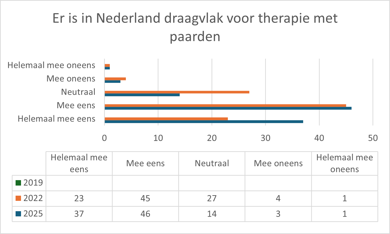 Ook de acceptatie van de therapeutische inzet van paarden laat een duidelijke stijging zien. In 2022 was de neutrale groep nog 27% en de (helemaal) mee eens groep 68%. In 2025 is de neutrale groep afgenomen naar 14% en zien we een stijging bij de (helemaal) mee eens groep van 83%. Kortom de neutrale groep is kleiner geworden en meer mensen spreken zich uit en doen dat positiever dan voorheen.